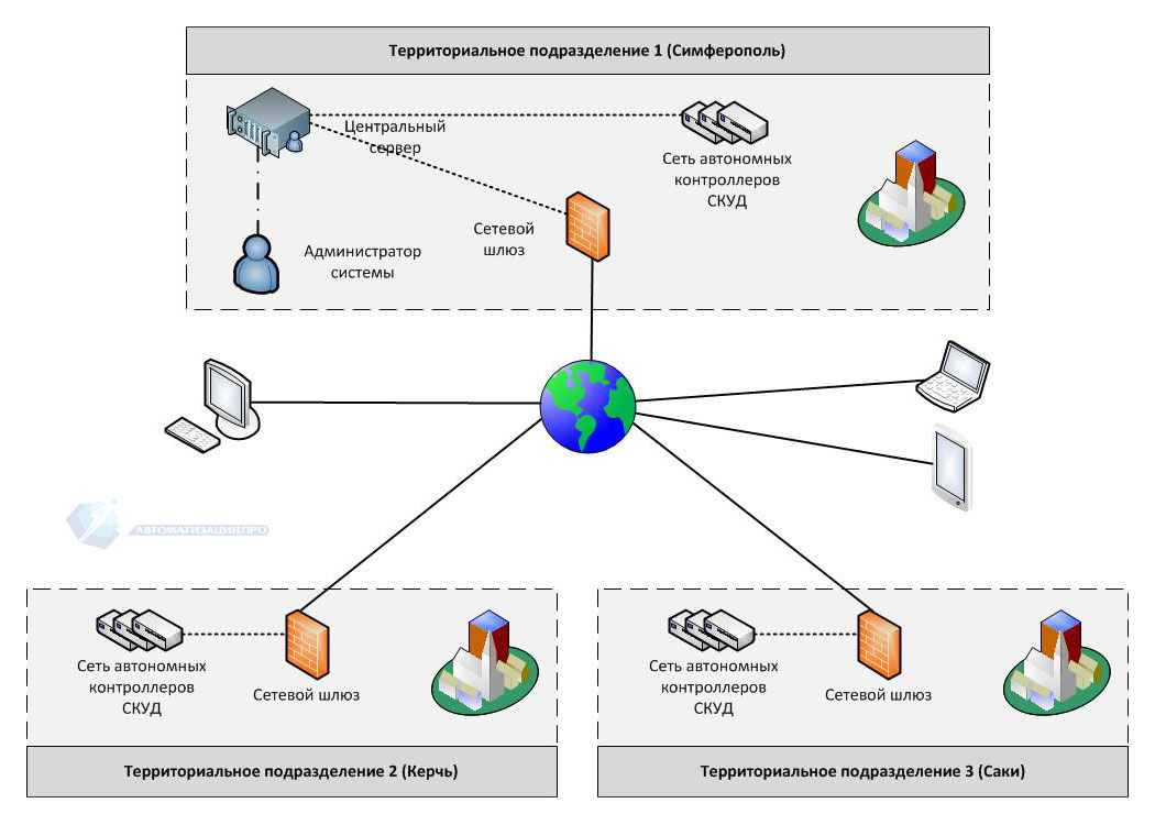 На всех территориальных объектах развернута сеть автономных сетевых контроллеров с достаточным количеством ПЗУ для хранениях правил доступа и генерируемых событий. Все контроллеры через ЛВС/Интернет подключены к центральному серверу, который находится в Симферополе. В промышленных и административных зданиях, помещениях, КПП, воротах смонтированы технические средства системы.